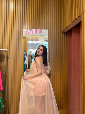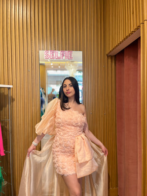 La manica a sbuffo aggiunge un tocco di grazia e femminilità, mentre la coda in organza garzata contribuisce a creare un effetto etereo e romantico.