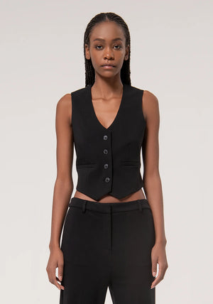 Gilet slim in tessuto stretch, scollo a V, bottoni centrali per apertura, e con tasche a filetto sul davanti.