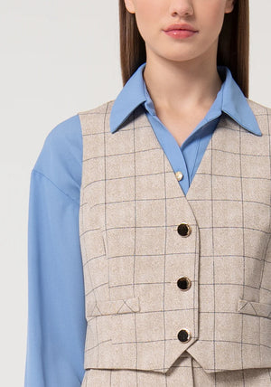 Gilet regular a quadri, scollo a V, bottoni centrali per apertura, tasche applicate, e senza maniche.