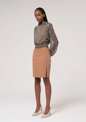 Gonna slim mini in tessuto stretch, vita regolare, accessorio metallico sul davanti, zip laterale, e con spacco su lato sinistro.