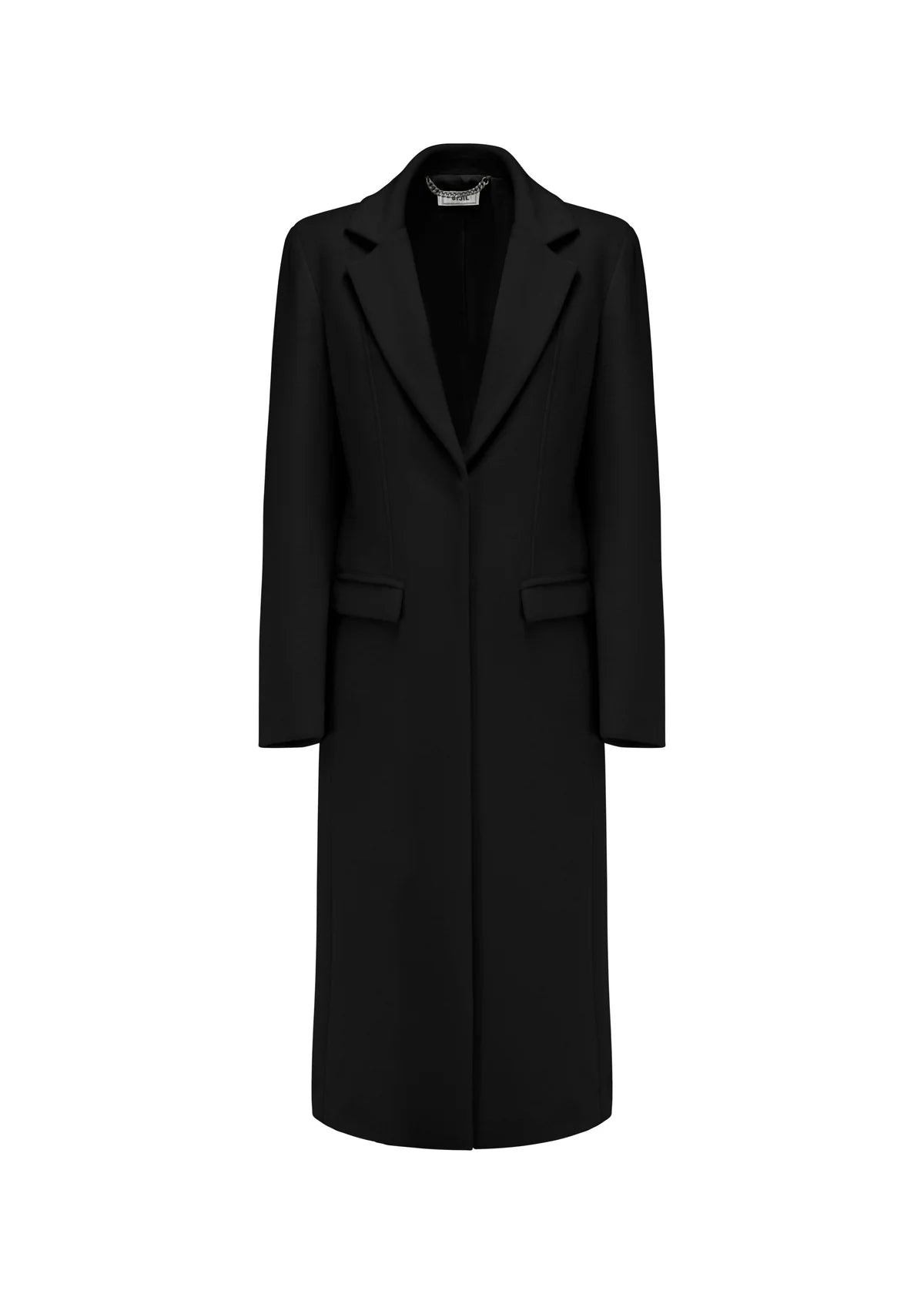 Cappotto lungo classico. Chiusura monopetto con bottoni a scomparsa. Collo a revers e tasche con patta.