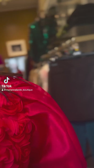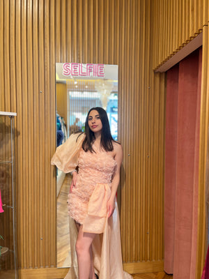 Abito corto/lungo presenta un tessuto unico realizzato da ghirigori di rose, conferendo un'estetica romantica e distintiva al capo.