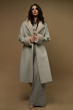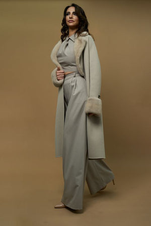 Cappotto lungo in cashmere certificato, applicazione di visone sul polsino e sul collo.